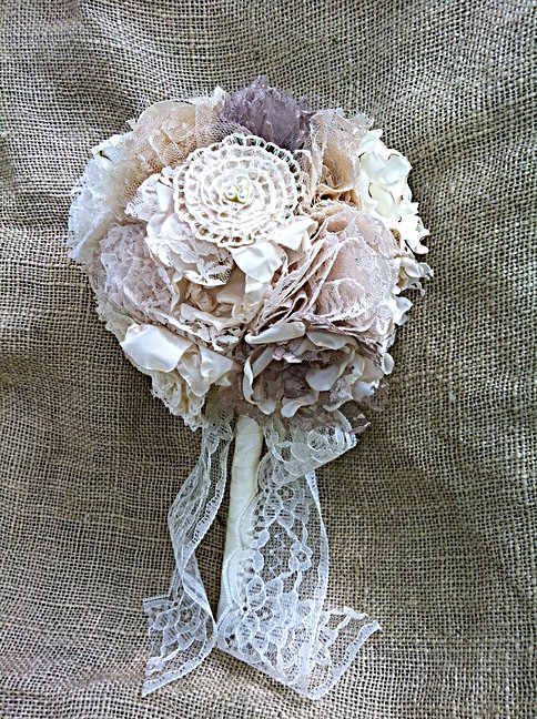 I have been working with a very creative bride on her upcoming shabby chic wedding. She decided she wanted to forgo the traditional wedding bouquet and decided to create ribbon/lace flowers to use for her bouquet. As a wedding florist, here in Meridian, I could not understand why someone would not want fresh flowers in their bouquet, but I was amazed when she brought these fabric flowers for me to arrange! They are absolutely gorgeous and fit her shabby chic theme perfectly.